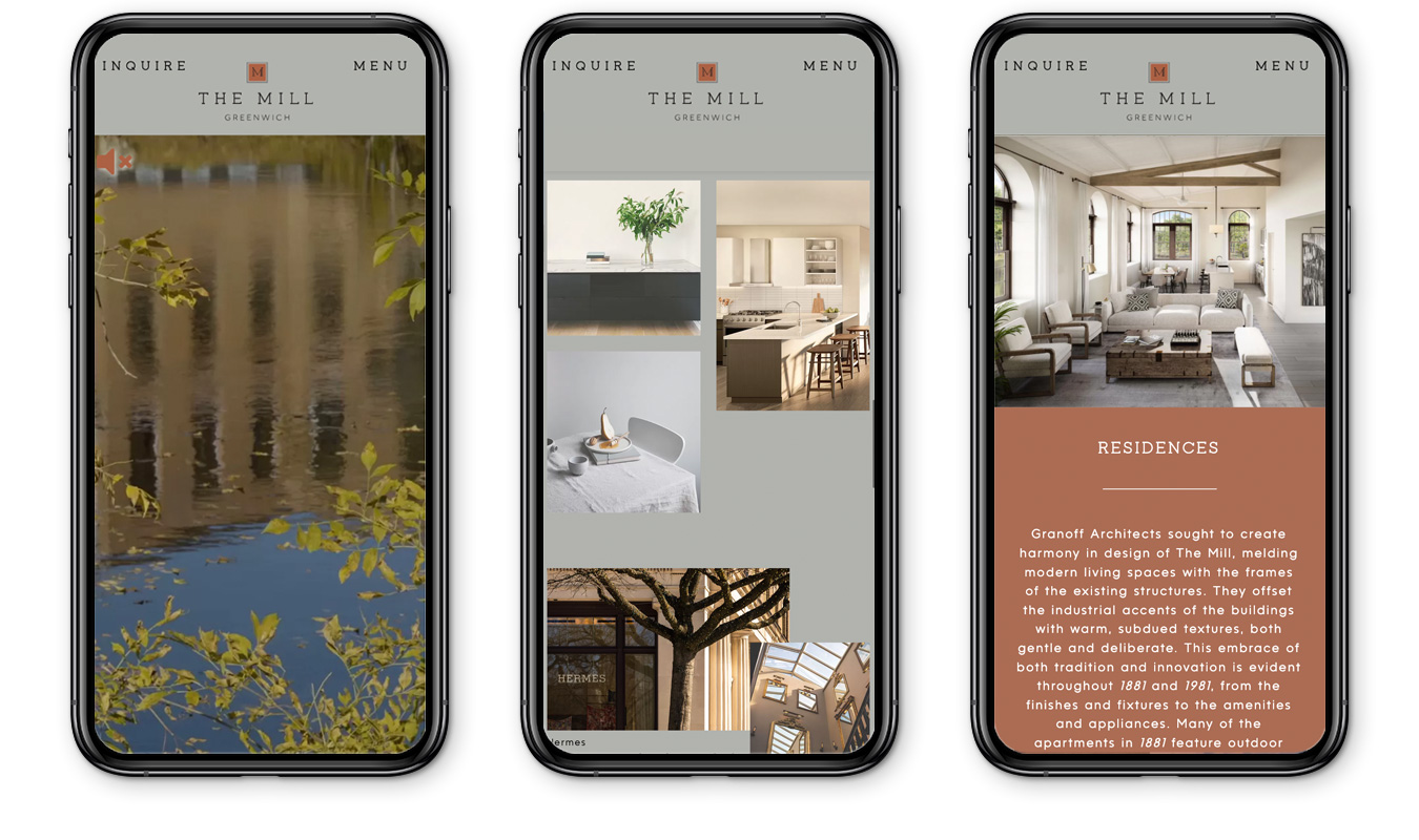 We were delighted to brand The Mill Greenwich, an adaptive reuse renovation of an old Mill site into luxury apartments. Set amongst the Byram river and an ear shot from downtown Greenwich, we positioned this property as a wellness enclave – where your home, services, and destination dining are all in a walkable village atmosphere. Through a combination of drone footage, carefully selected stock that capture lifestyle, mood, texture and emotion, and detailed renderings of the amenities, buildings and interiors, we were able to highlight the significance of everything The Mill has to offer – a community rooted in a rich heritage and the natural beauty of its surroundings.